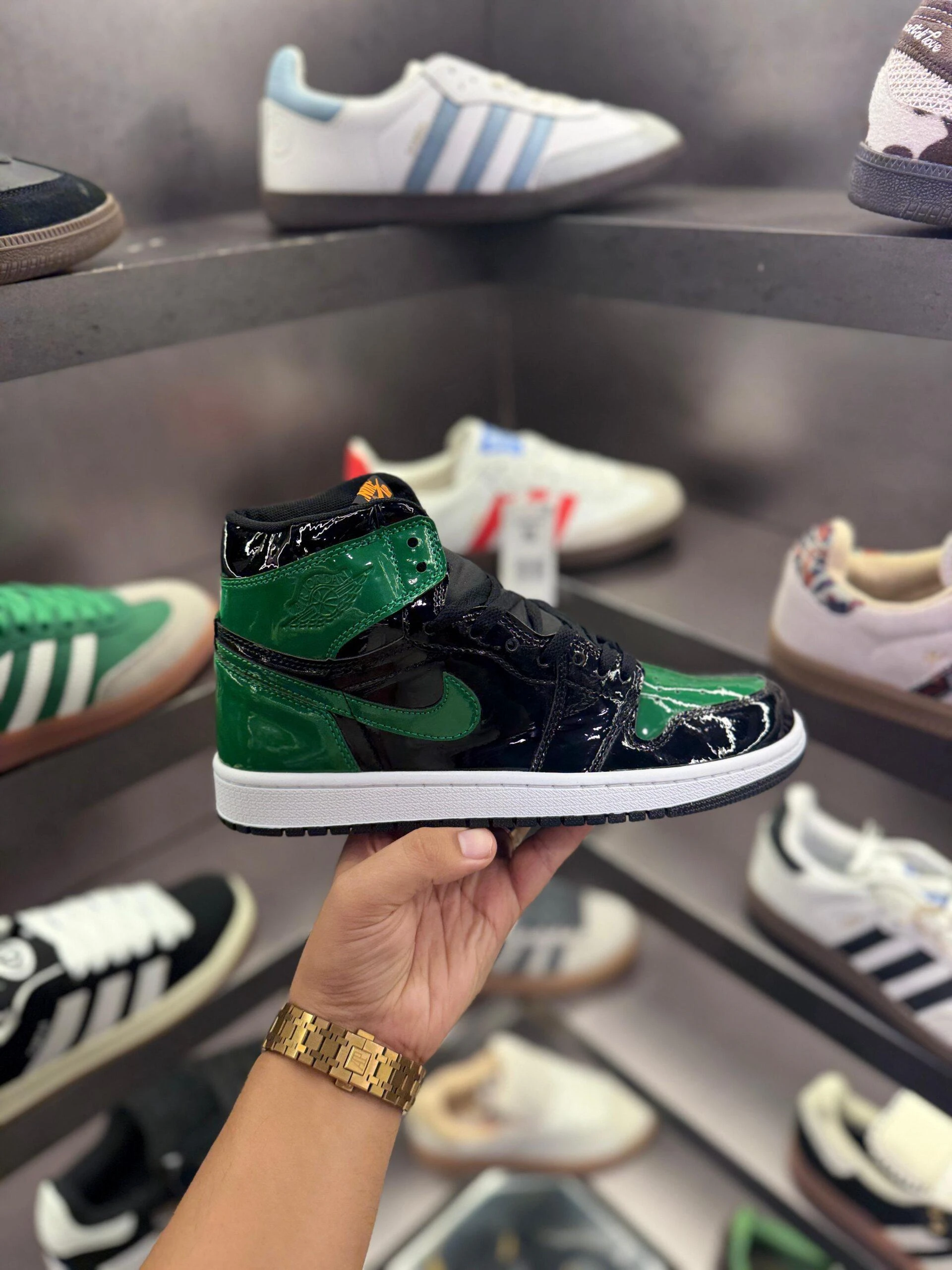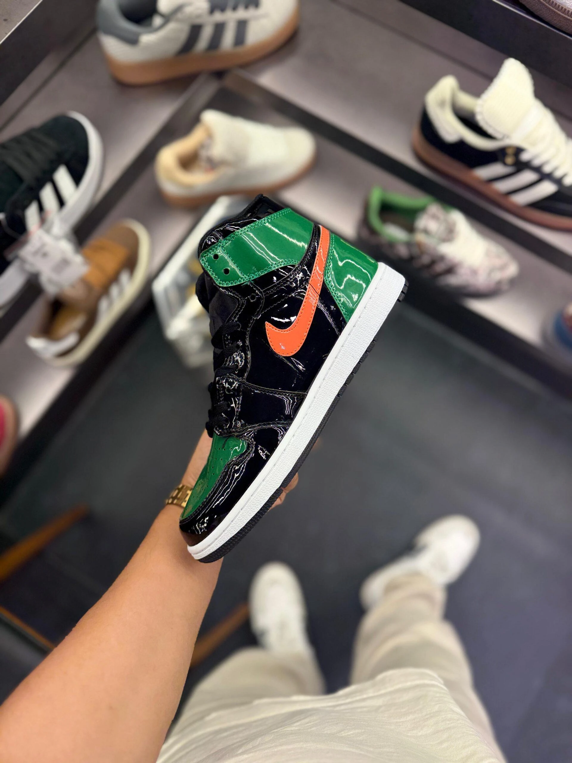 Color Scheme: They feature a prominent black and vibrant green color blocking, with a contrasting orange Nike "Swoosh" logo on the side. Material: The dominant material appears to be a shiny, reflective patent leather or a similar high-gloss synthetic material. Design Elements: The classic Air Jordan wing logo is visible on the ankle collar, and the sole is white, providing a clean contrast to the dark upper. |
