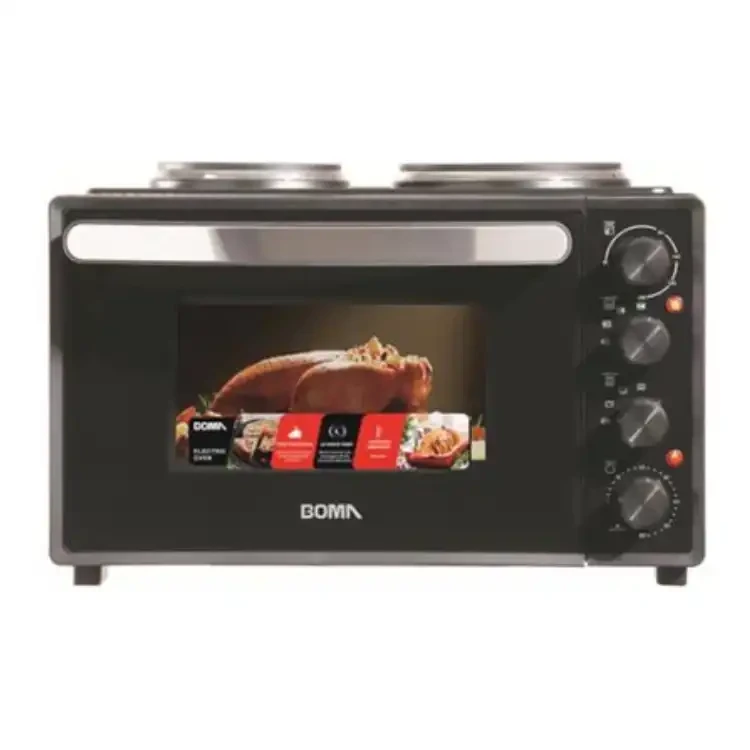 This is a BOMA countertop electric oven designed for versatile cooking, baking, roasting, and grilling. It features a transparent glass door for easy monitoring of food, three control knobs for temperature, function, and timer settings, and side ventilation for heat dissipation. The oven is suitable for preparing a variety of dishes, from roasted chicken to baked goods, and is ideal for home kitchens where space efficiency and multi-functionality are important. he 30L capacity is generous: holds approx. 8x bread slices - enough for a one-person meal. Adjust the temperature between 60-230℃, with the choice to use the upper grill or lower grill individually - or together. Small over also has handy 60-minute timer. ● Color: Silver |