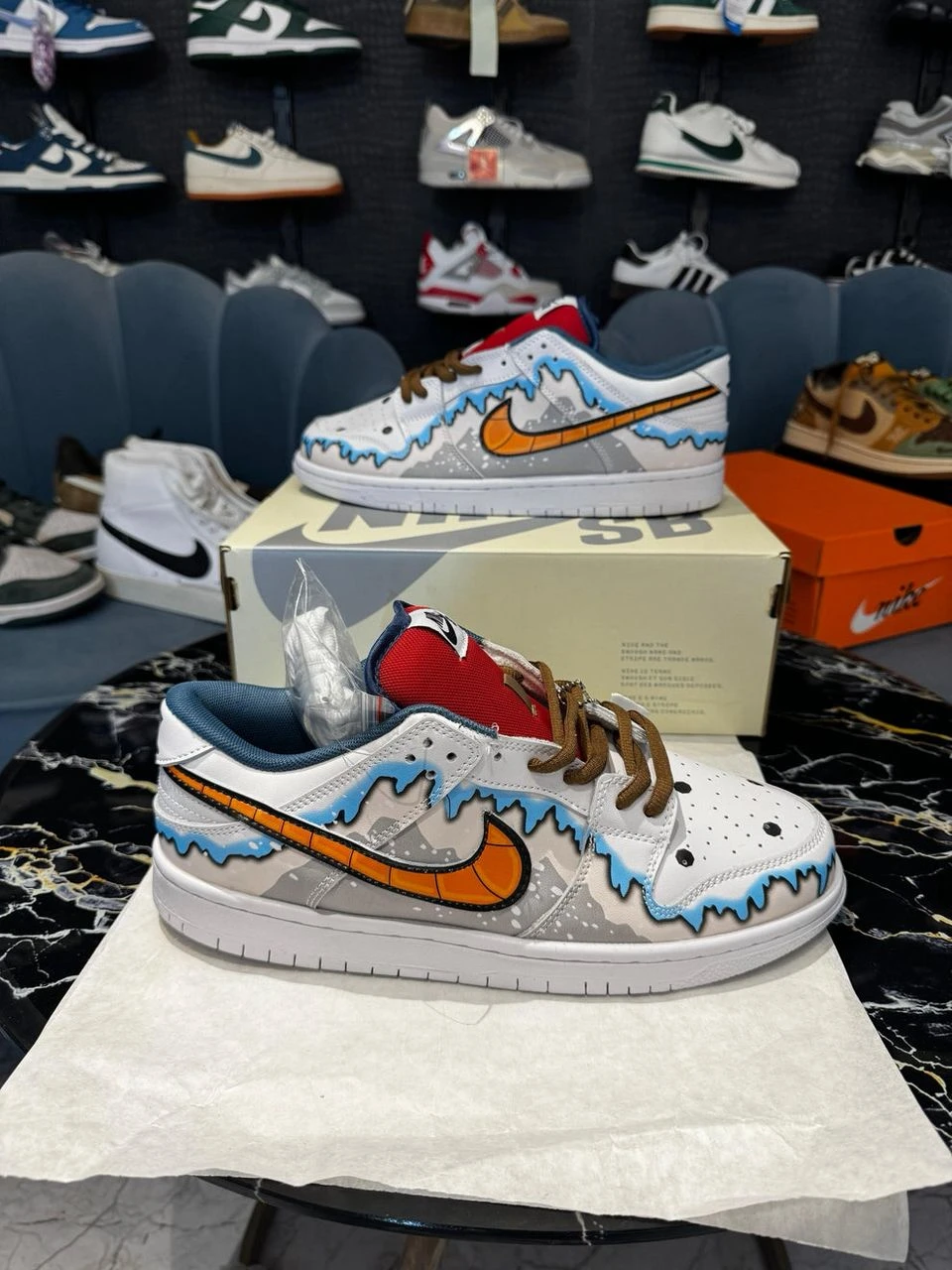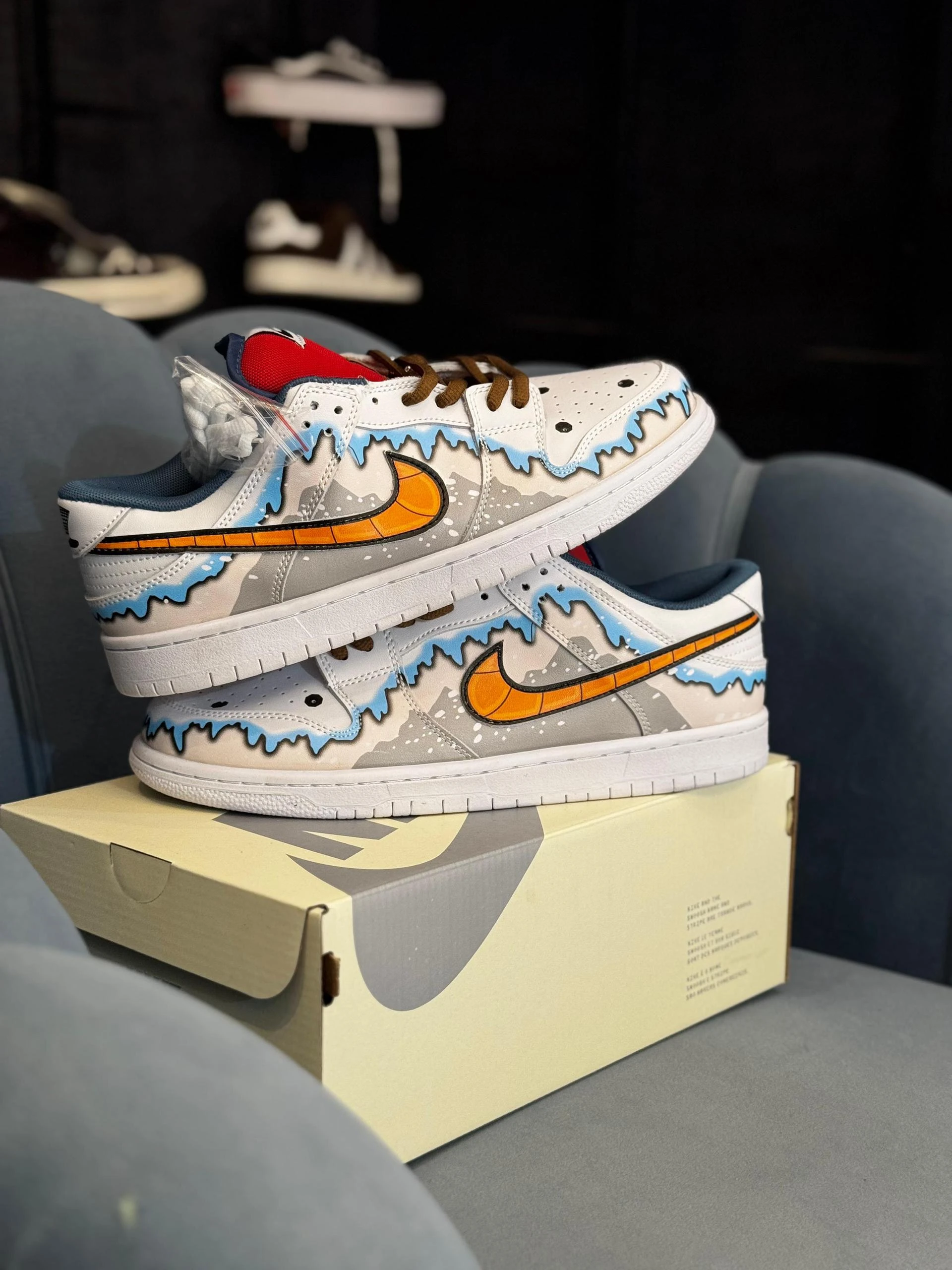 Model: Nike SB Dunk Low. The specific design suggests it might be a special edition like the "Snowman" or a custom creation. Features: Known for a classic look, durable materials, foam midsole for cushioning, and a rubber outsole for traction. |