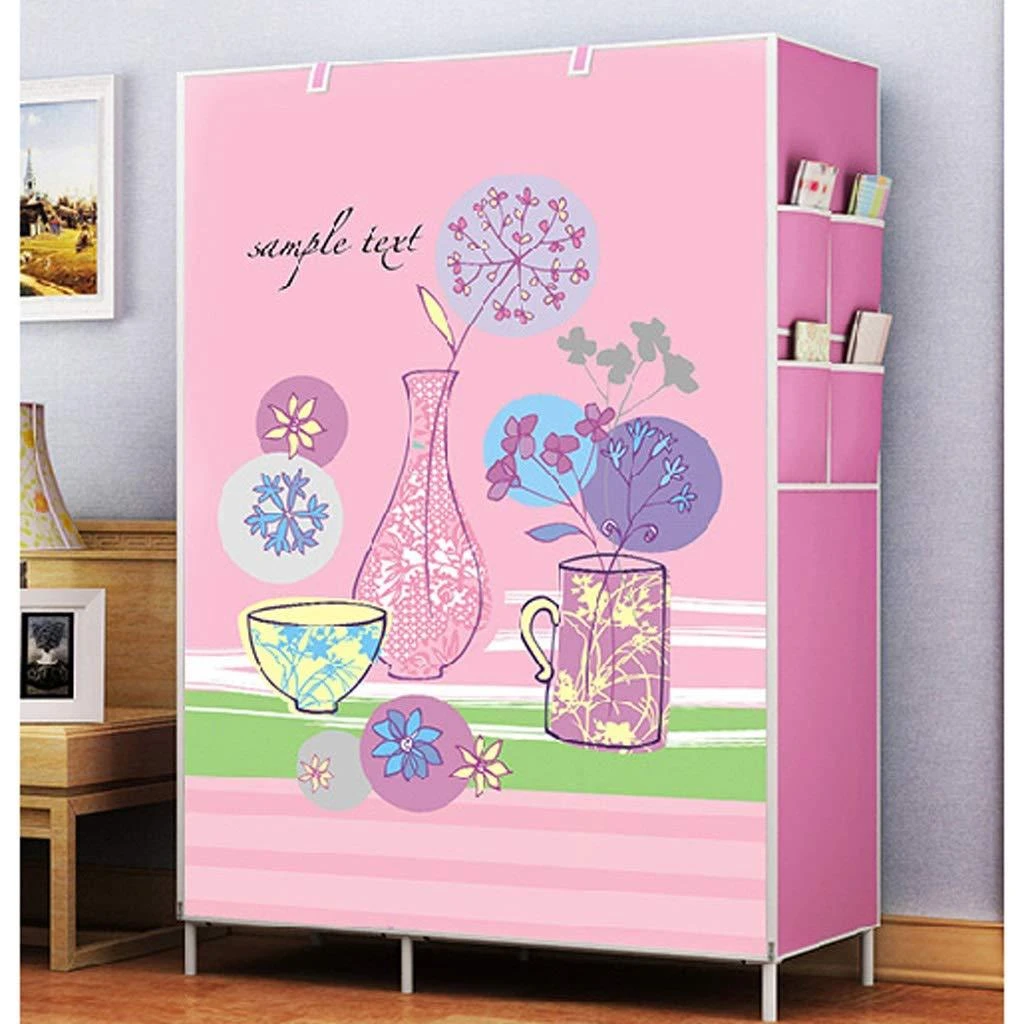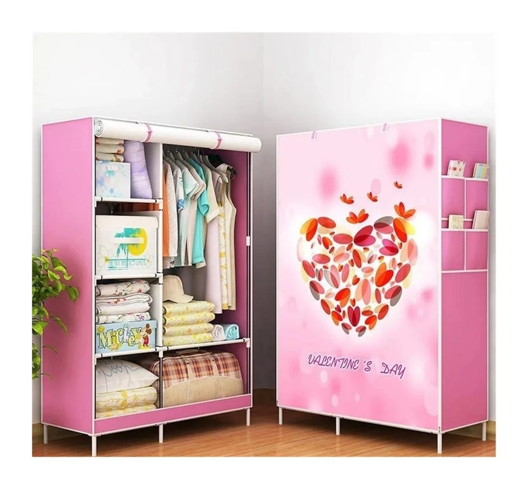 This is a portable, fabric-covered wardrobe designed for clothing and linen storage. It features a lightweight metal frame covered with a durable fabric material. The wardrobe has multiple compartments, including hanging space for clothes, shelves for folded garments, and side pockets for small items. The right unit has a decorative printed cover showing a scenic illustration of a train, mountains, and trees, which can be rolled up to access the contents. This type of wardrobe is easy to assemble, lightweight, and ideal for bedrooms, dorm rooms, or temporary storage needs. |