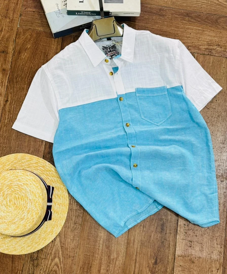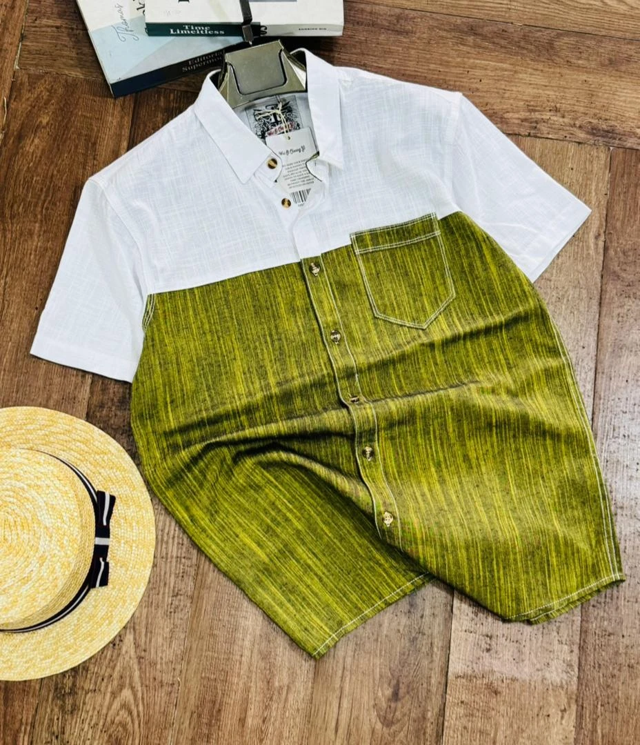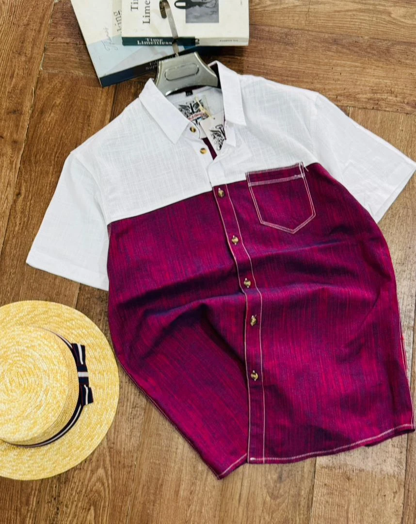 This is a men's short-sleeve button-down shirt that features a spread collar and a single chest pocket on the left side. The fabric appears to be a lightweight material, possibly a cotton or linen blend, suggesting it is a casual and comfortable garment for warm weather. It has a traditional fit. The shirt's design incorporates two distinct, solid sections of fabric that are sewn together, creating a bold visual effect. |