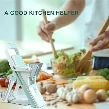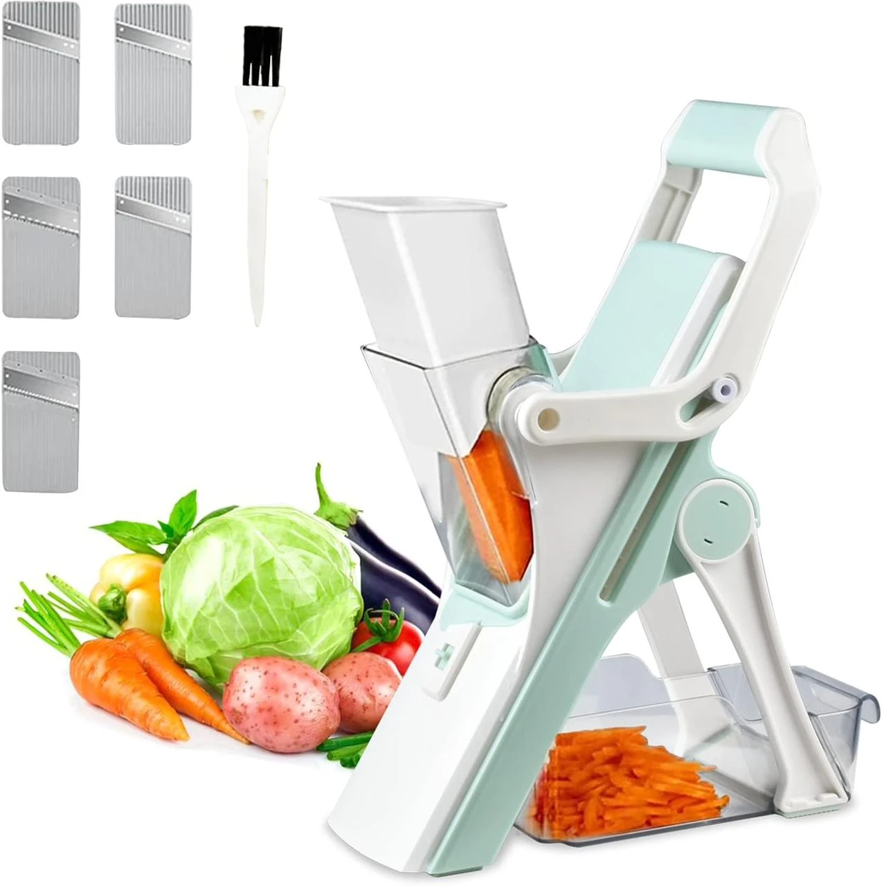 This is a multi-functional kitchen tool designed for shredding, slicing, and julienning vegetables, fruits, and certain meats. It features a standing frame for stability, a safety handle for secure grip, and a food chute to protect hands while feeding produce into the slicer. The sharp blades allow for quick and uniform cutting, and the collection container at the base keeps the workspace clean. It can be used for preparing salads, stir-fries, garnishes, and more. |